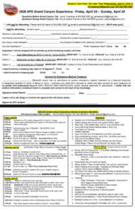 Grand Canyon 2026 AFS Arizona is excited to announce information about the Grand Canyon trip on April 24-26. Each host parent and student must fill out and sign this form:(You can click HERE or on the form for a downloadable version)This also includes the schedule for the trip, including important drop-off and return information.Please sign and return the form to Jenny Treadway at jstreadway25@google.com.Forms are due by April 6, 2026.